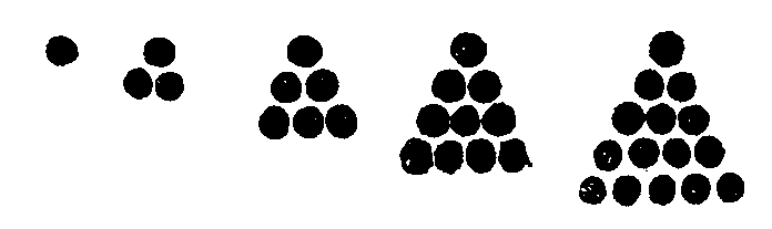 Now, to take a more intricate example, let any boy who reads this lay down five marbles separately in a row. Then let him place two marbles under each one but the first; and next three more under each group, beginning with the third; and again four more under each, beginning with the fourth; and so on, commencing always one group later, and adding one marble more each time. He would have such an arrangement as this: