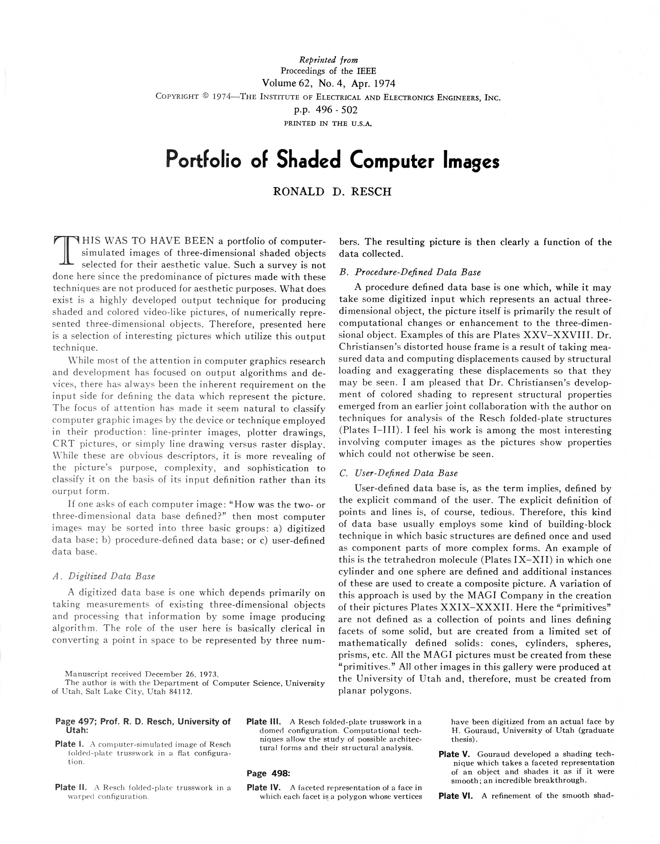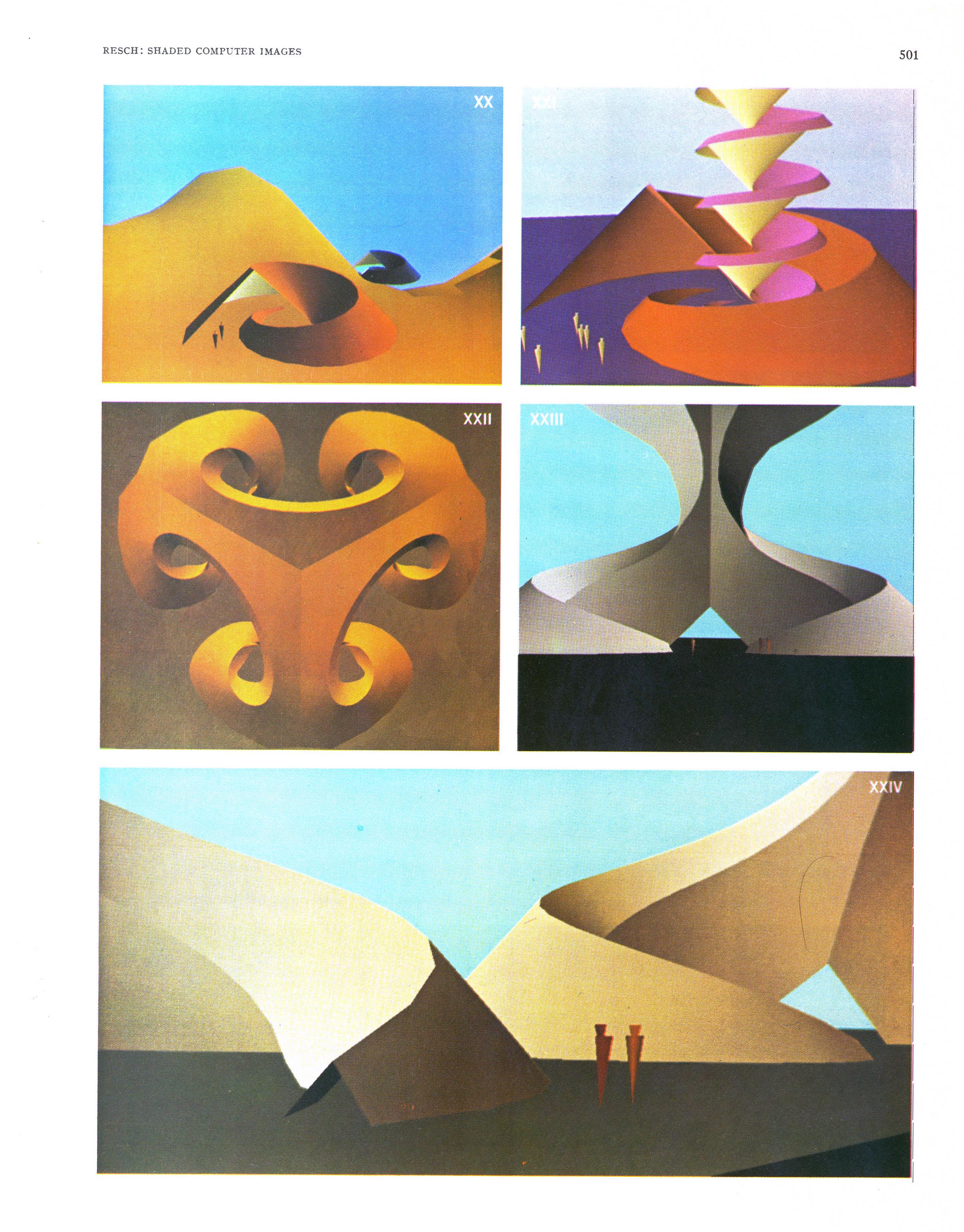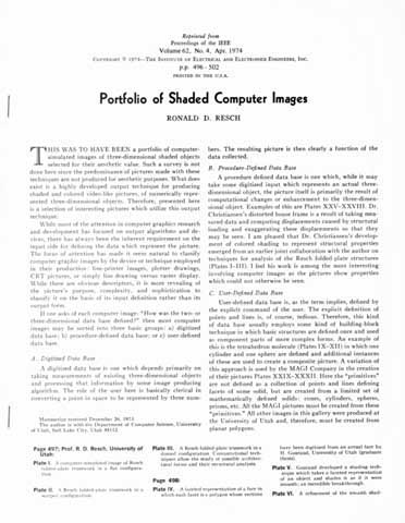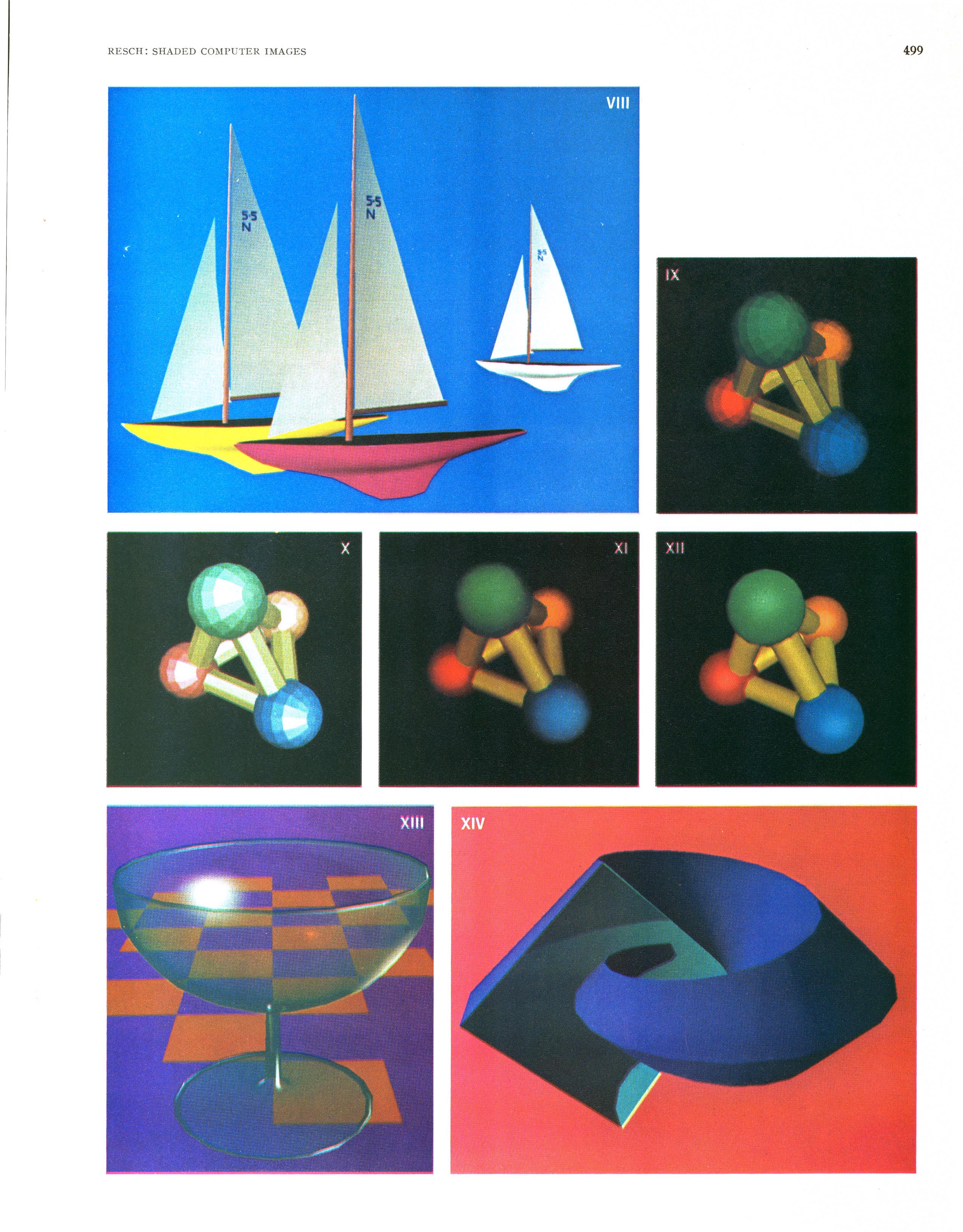 selected for their aesthetic value. Such a survey is not done here since the predominance of pictures made with these techniques are not produced for aesthetic purposes. What does exist is a highly developed output technique for producing shaded and colored video-like pictures, of numerically represented three-dimensional objects. Therefore, presented here is a selection of interesting pictures which utilize this output technique.