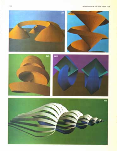 Plates XIV-XXIV. These photographs are the work of the author, Associate Research Professor, University of Utah, with programming assistance from E. Cohen. All of the images are computer simulations of highly constrained three-dimensional models. Their data representation is completely defined by the program and the user, rather than being digitized, as no physical objects exist. Such computer images allow us to study the architectural and structural possibilities of nonexistent definable forms that could not otherwise be observed. For instance, Plates XIV-XXIV (with the exception of Plate XIX) are three-dimensional structures which may be developed from flat sheet material with a folded, curved edge and observed as structure.